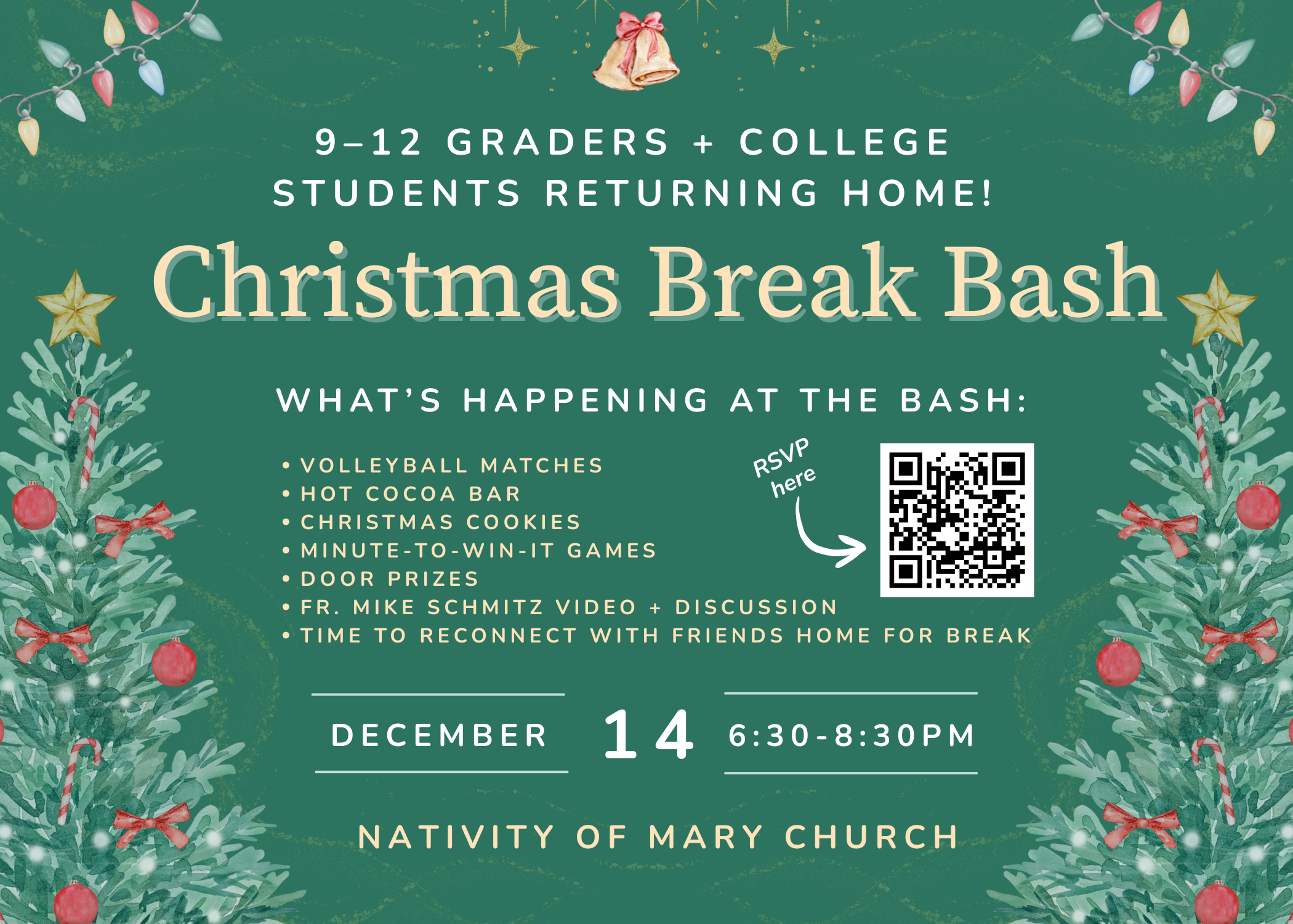 Next Event: Christmas Break Bash 12/14, 6:30-8:30 PM, EVENT FOR RETURNING COLLEGE STUDENTS AS WELL! RSVP with the QR code below or click here.