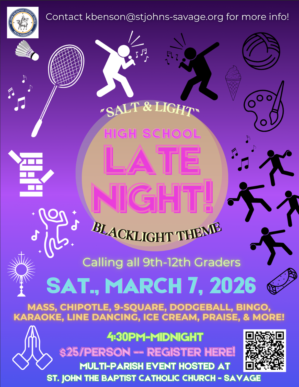 Evenings will include a mix of fellowship, small group discussions, games, food, prayer, service, and plenty of fun! This group is for teens who want to grow in their faith while building friendships with other teens from the Nativity community.