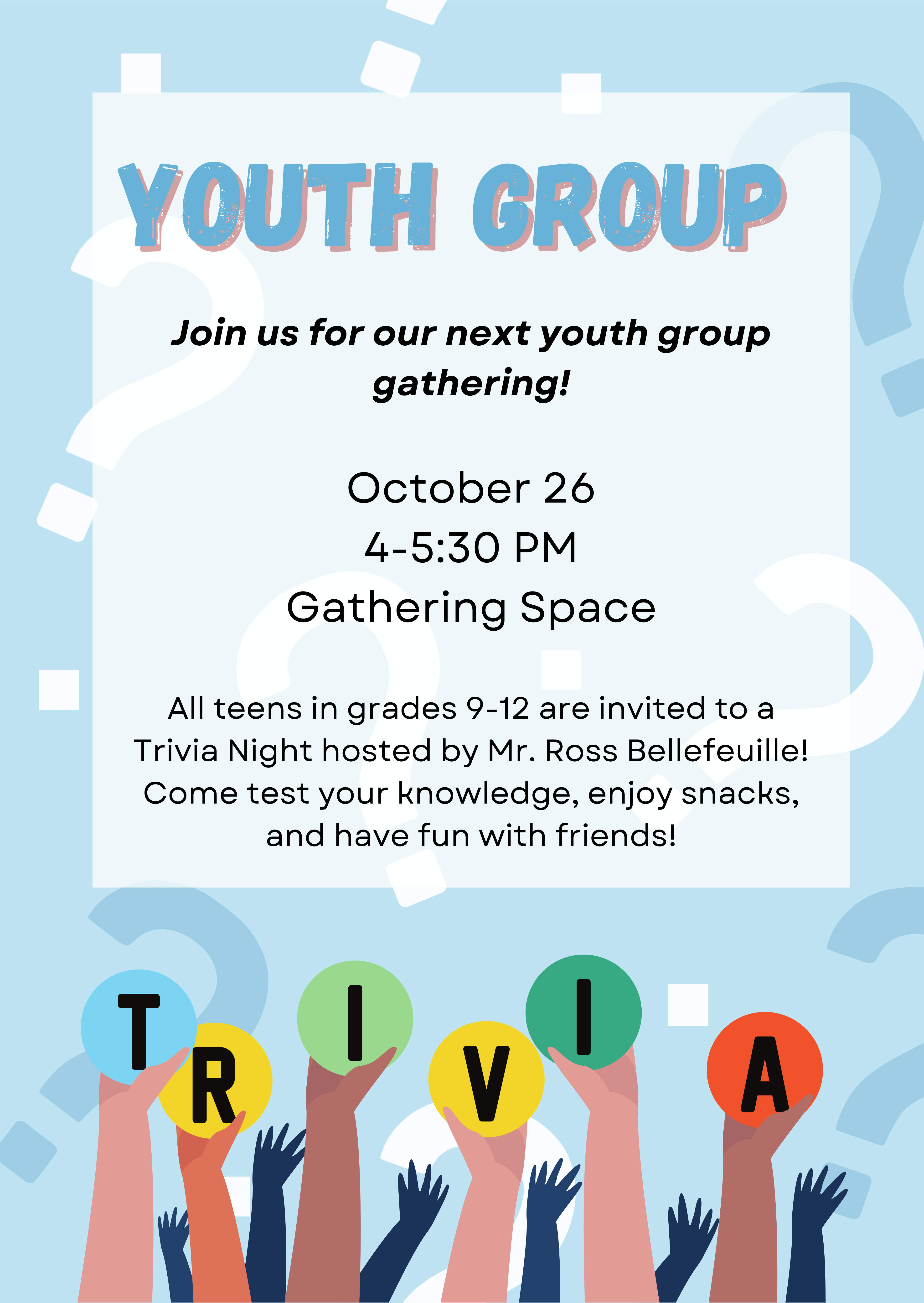 Next Event: October 26 , 4-5:30 PM featuring Quick Catholic Lessons by Father Mike Schmitz & a fun evening of Jeapordy Trivia!